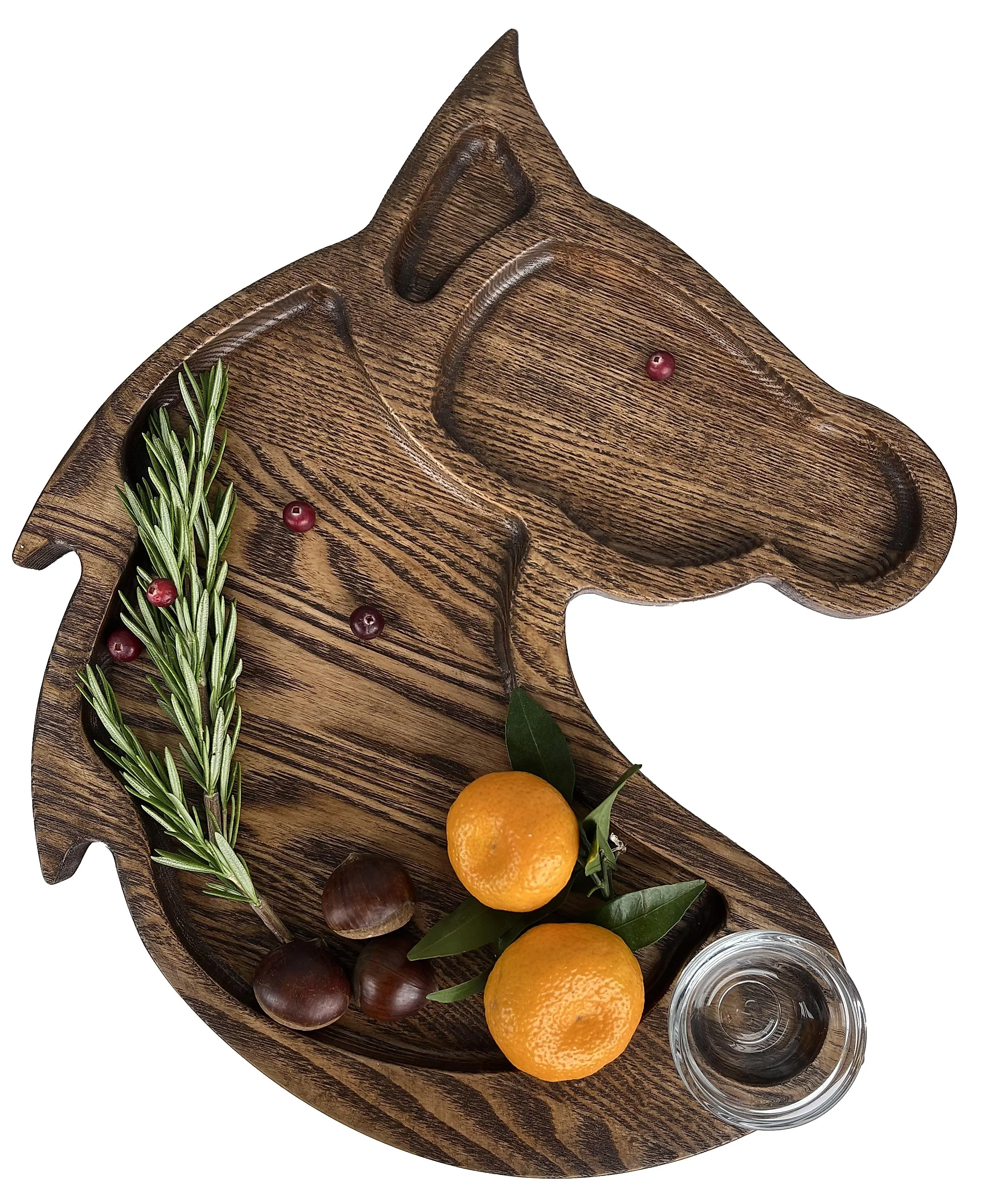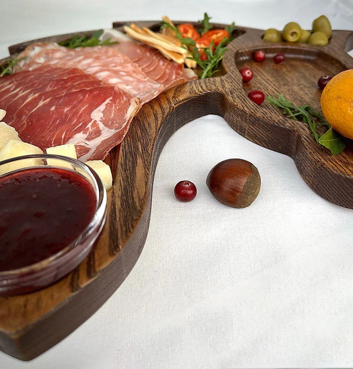 Менажница «Огненная лошадка» (большая) с соусником 30мл (стекло) Размер: 32×36 см За счет выразительного силуэта эффектно выглядит на столе. Удобна для фуршетов. Подходит для сервировки сырных и мясных тарелок, фруктов, закусок итп. Есть углубление под соусник 30мл (идет в комплекте). Покрыта сертифицированным ЭКО маслом, безопасным для контакта с пищей. В розницу поставляется в фирменной подарочной коробке; оптом — в транспортировочной упаковке. Проверенная идея от нашей компании: принесите любимому человеку на этой «Огненной лошадке» завтрак в постель и наслаждайтесь огненными чувствами! Цены: • Розница: 3 200 ₽ • Аренда (сутки): 400 ₽ (от 3 дней) • Корпоративный заказ (брендирование) и опт от 10шт: цена по запросу